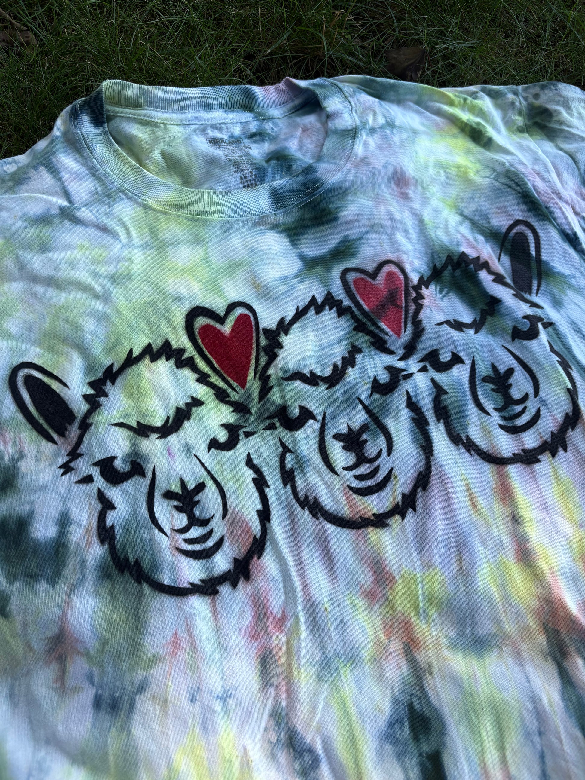 This one-of-a-kind t-shirt is inspired by our own alpacas. The design is originally drawn and carefully hand-cut into a stencil by Jason Mowery. The stencil is then spray-painted onto the shirt using vibrant, washable fabric specific spray paint and tie dyed.